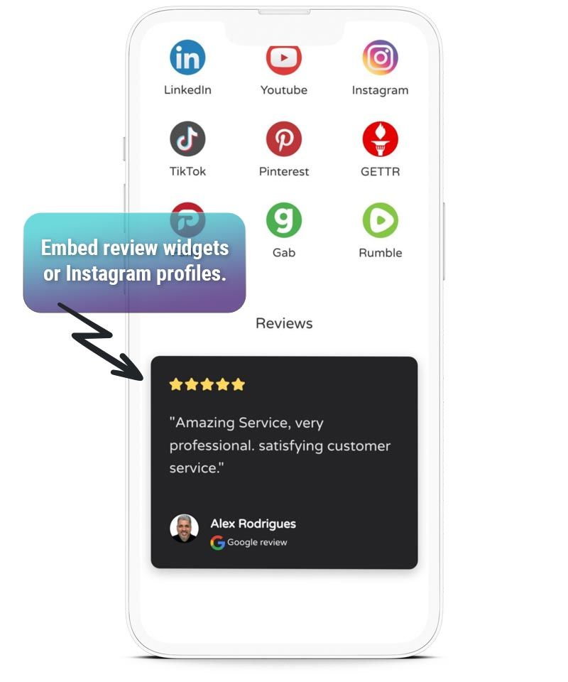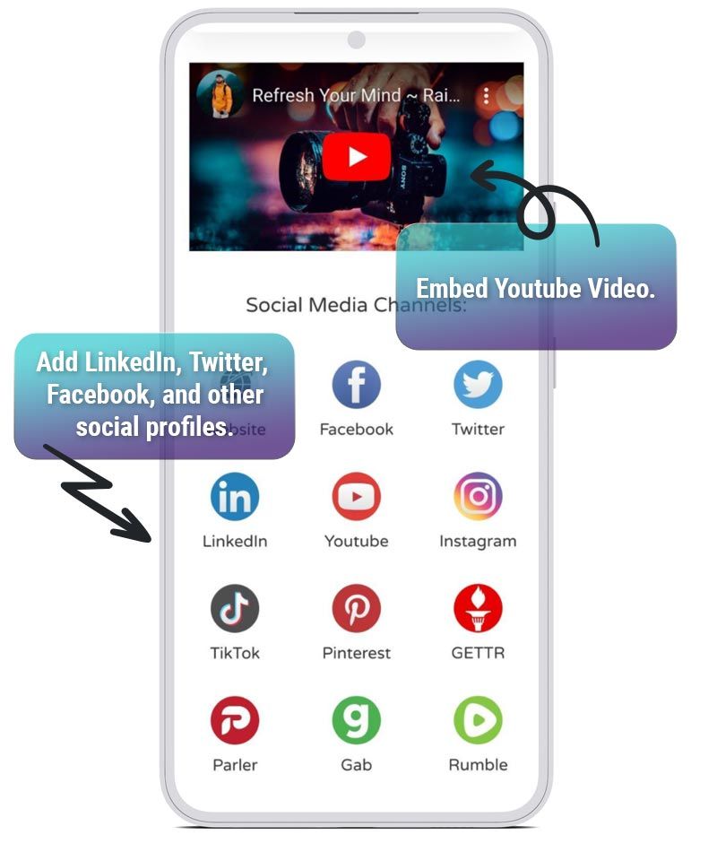 Spice up your digital business card by adding your social media links, YouTube, or Vimeo video.