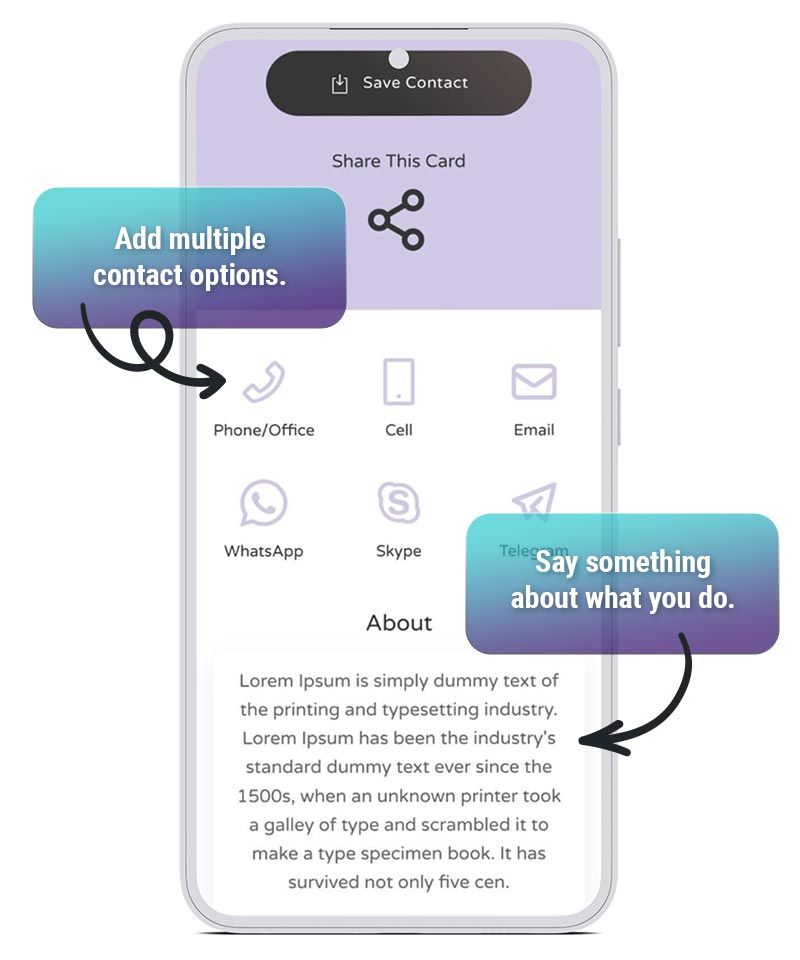 With a digital business card, you can express yourself in new ways. Select the contact forms you want to share and talk a little about what you do.
